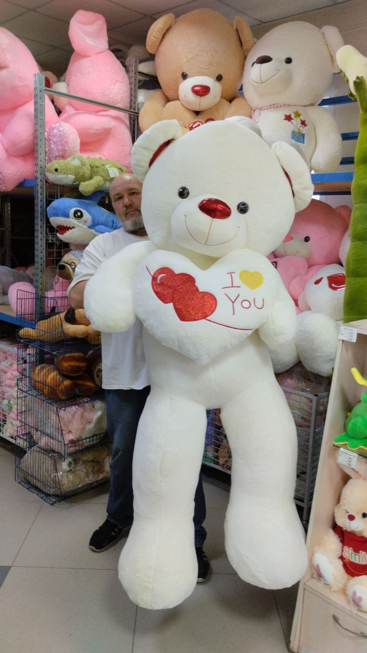 Мишка белый с белым сердцем и картинкой на нем 200 см.