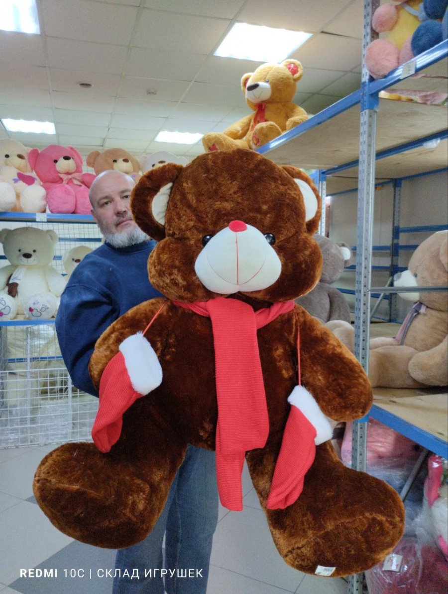 Мишка коричневый с варежками и шарфом 90 см.спина